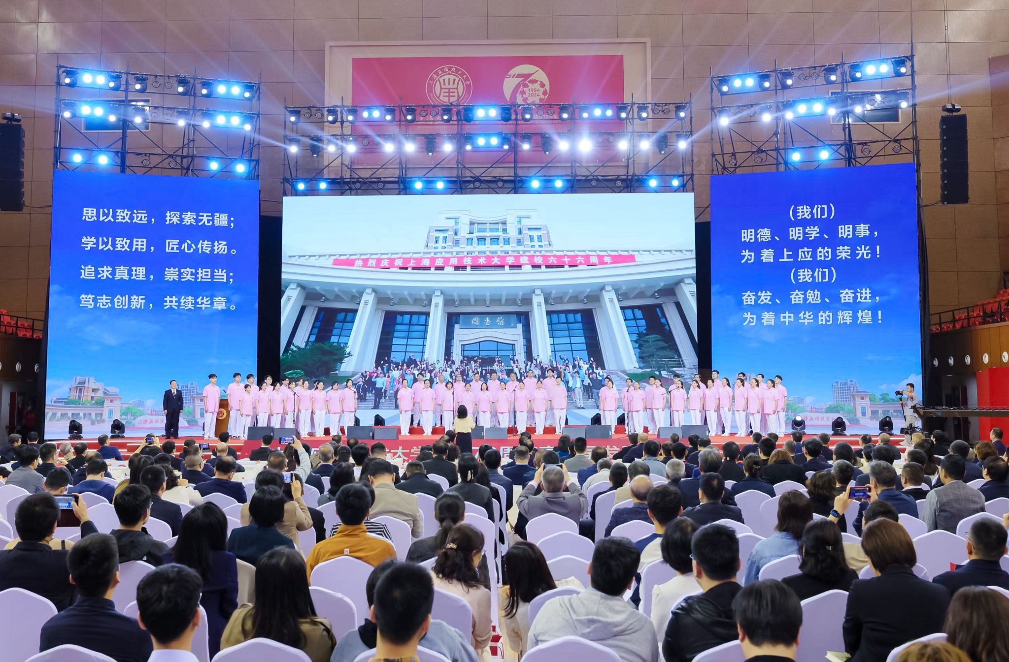 大会最后,与会领导嘉宾、师生校友共同唱响上海应用技术大学校歌《为着上应的荣光》,激昂的旋律回响在会场上空。