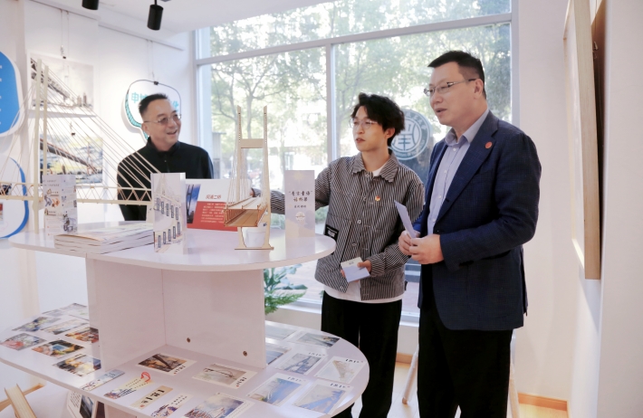 午餐会开始前,汪小帆参观了2023年“知行杯”上海市大学生社会实践大赛特等奖项目“‘青言童语’共话江河文脉,百桥图鉴同载城市未来”成果展览。