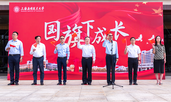 郭庆松在奉贤校区升旗仪式现场发表热情洋溢的讲话,带领师生深情回顾74年来中国共产党团结带领全国各族人民艰苦奋斗取得的巨大成就。他表示,学校伴随着新中国应运而生,始终与祖国同步伐、与人民共命运,经过一代代上应人的挺膺担当、接续奋斗,学校发展驶入快车道、迈上新台阶。明年学校将迎来70周年校庆,全校师生将共同见证学校70载的光荣与辉煌。