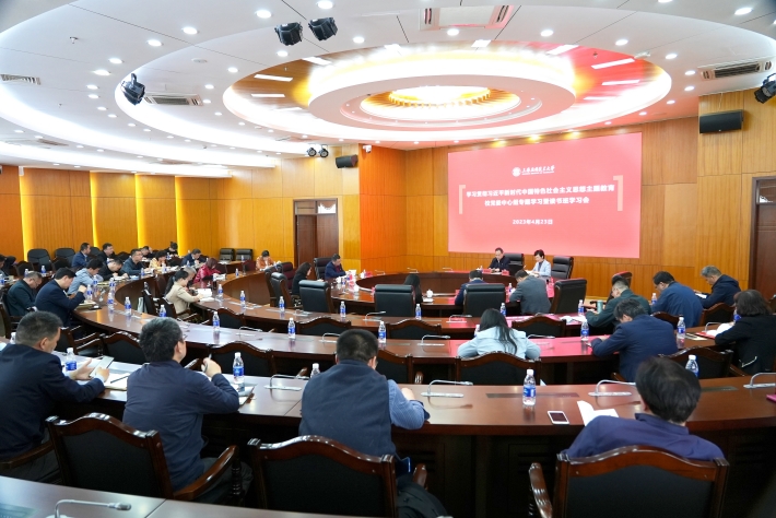 4月23日上午,校党委理论学习中心组举行学习贯彻习近平新时代中国特色社会主义思想主题教育专题学习会暨读书班开班学习会。校党委书记、主题教育领导小组组长郭庆松主持专题学习会并作读书班开班动员。校党委副书记、校长、主题教育领导小组组长柯勤飞领学原文。马克思主义学院于新东教授应邀作专题学习辅导报告。