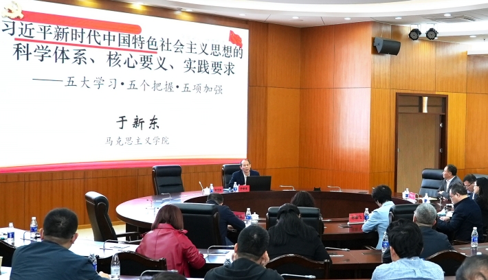 于新东以《习近平新时代中国特色社会主义思想的科学体系、核心要义、实践要求》为题,通过“三大主要判断标准、三大主要组成内容、三大主要鲜明特点、三大突出意义、三大主要问题”等,对习近平新时代中国特色社会主义思想的科学体系做了系统全面的阐述。对于如何学习好、把握好和实践好习近平新时代中国特色社会主义思想,于新东提出“五大学习、五个把握、五项加强”的理论观点,就学习习近平新时代党建理论、习近平新时代使命任务论述、习近平全面建设现代化学说、习近平全面深化改革的理论、习近平“两个大局”的论述等,分别给出了“把握核心中心、把握时势形势、把握总体整体、把握动力活力、把握国内国际”的学习思路。