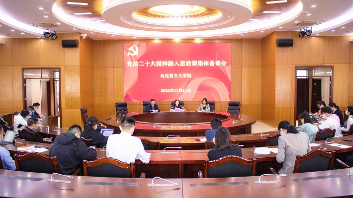 为进一步深入学习宣传贯彻党的二十大精神,切实推动党的二十大精神进教材、进课堂、进头脑,11月11日,“党的二十大精神进思政课”集体备课会召开。校党委书记副书记陈海瑾出席并讲话。马院直属党支部书记杨燕华主持,马院全体教师参加。