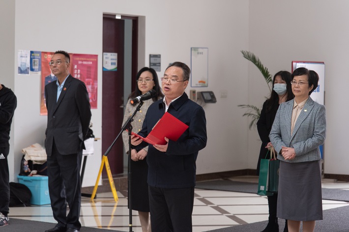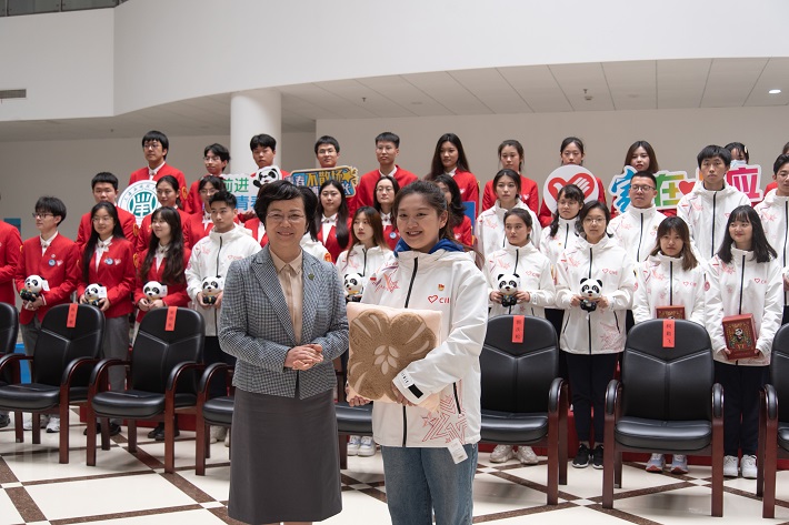 党委办公室、校长办公室、党委学生工作部、安全保卫处、后勤保障与服务中心、校团委等部门有关同志陪同慰问,部分机关部门负责人为第五届进博会志愿者学生骨干、二年级“小叶子”赠送礼物。