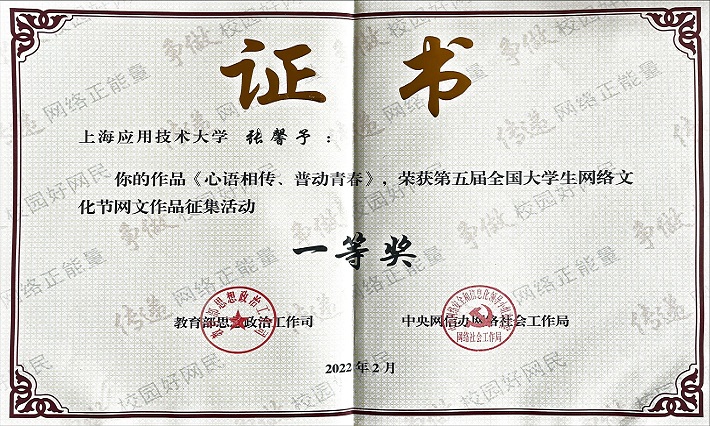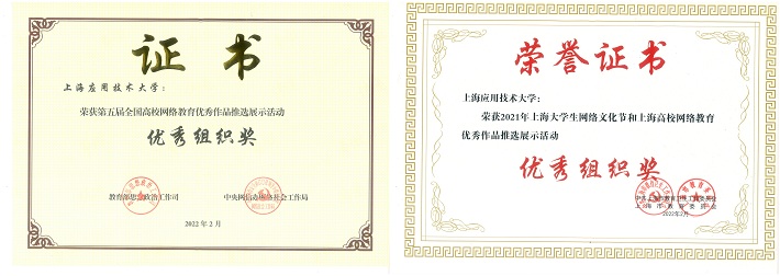 上海市教委同步举办上海高校“学习四史践使命,传播青春正能量,争做校园好网民”高校网络文化节活动,我校师生积极参与网络文化作品创作,经学校征集初选上报,共推选12类、854件作品报送市教委,共获一等奖3项、二等奖8项、三等奖16项及优秀原创音乐1项,数量创历年新高;其中学生获奖作品22项、教师获奖作品6项,学校获“上海市大学生网络文化节”和“上海高校网络教育优秀作品推选展示活动”优秀组织奖。