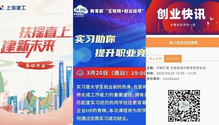 充分对接国家“24365”平台就业资源,学校就业“云资讯”一键式获取,让学生第一时间了解就业最新讯息。升级和开通“就业微新闻”“上应就业”视频号,设立《就业云招聘》《就业云宣讲》《就创政策解读》《就业菁英》《就业微课堂》等18个新闻专栏,实现就业新闻日日读、就业岗位天天送、就业数据周周报、就业知识日日学、就业难点时时清。3月至今,学校累计发布就业微新闻300余条,浏览量10万余次,有力推进了2022届毕业生云端就业。