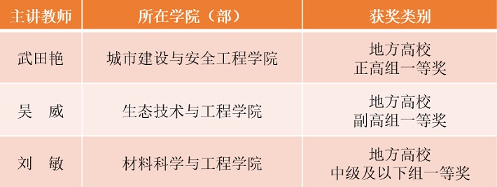 城市建设与安全工程学院武田艳、生态技术与工程学院吴威、材料科学与工程学院刘敏3位老师代表学校参赛,分别荣获地方高校正高组一等奖、地方高校副高组一等奖、地方高校中级及以下组一等奖。