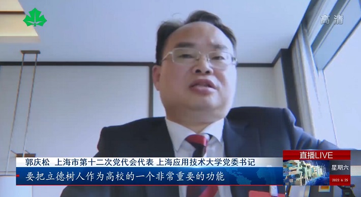 上海应用技术大学党委书记郭庆松参加市十二次党代会。作为党代表,郭庆松以饱满热情参加会议,在团组审议中积极发言、在媒体采访中畅谈体会、在党报媒体中亮明观点。