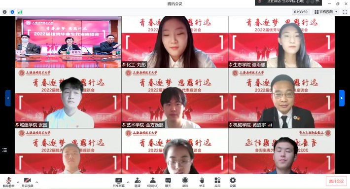 “希望你们在未来的人生路途上,始终秉持上应大校训,传承上应大精神,用激情和理想逐梦,用奋斗和奉献圆梦。”5月24日上午,上海应用技术大学“青春逐梦·思恩行远”2022届优秀毕业生代表座谈会举行,校长柯勤飞通过“云端”与毕业生代表亲切座谈,分享收获与成长,展望未来与期许。校党委副书记、副校长王瑛出席座谈会。