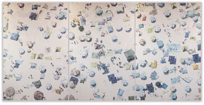 汤曙的“海滩系列”是在全球新冠疫情大流行期间创作的,他使用直接、堆叠的笔触以简洁自发的方式去描绘自然物像,并在视觉表达中传递触觉感受。《海滩 No.8》是艺术家以上帝的视角描绘海滩度假的场景。他似乎用照相机的语言捕捉远处的景色,聚焦一个焦点,将太阳伞和人物分解成抽象的色块和笔触。这幅画引导观者从无所不知的角度认识物体的自然属性,并在二维空间中构建叙事。《海滩No.8》似乎预示着疫情终将过去,鼓励人们共同展望更美好的未来。