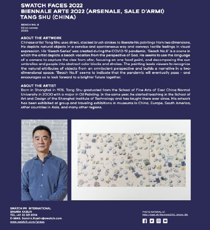 日前,第59届威尼斯国际艺术双年展开幕,来自58个国家的213位艺术家参展。我校艺术学院教师汤曙的作品《海滩 No.8》入选本届威尼斯双年展Swatch faces 2022主题展。