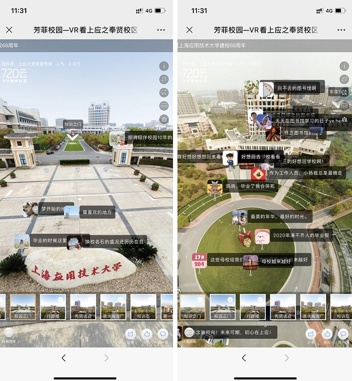 本次“云校庆”分为 “云报到”“云展览”“云游校园”“云捐赠”“云合影”和“云抽奖”六大版块,“云报到”在报到人填写相关信息后自动生成“报到证”,可下载保存并分享至朋友圈。“云展览”全方位展示学校在人才培养、科学研究、学科建设、国际交流等方面取得的成绩。“云游校园”通过VR实景呈现奉贤校区和徐汇校区的怡人风光和文化景点,校友们可选择任意景点打卡并留言。“云捐赠”开启了线上捐赠平台,“化育桃李,涓流汇海”,倡议校友们共同为学校发展助力。“云合影”通过上传个人照片和母校“云端”合影定格校园记忆。“云抽奖”在送出对母校的祝福后可抽取“盲盒”获得意外惊喜。