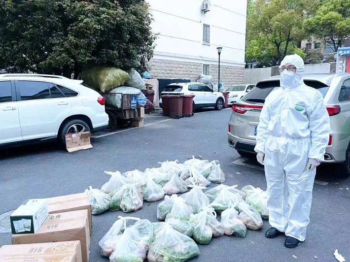 闵行区梅陇镇是此次疫情防控重点区域,继续教育学院杨颖丽老师主动请缨,加入所在社区疫情防控志愿队伍,她协助社区做好封控区内居民的生活保障工作,为封控隔离楼的居民分菜,按照整理出来的名单逐户上门派送。