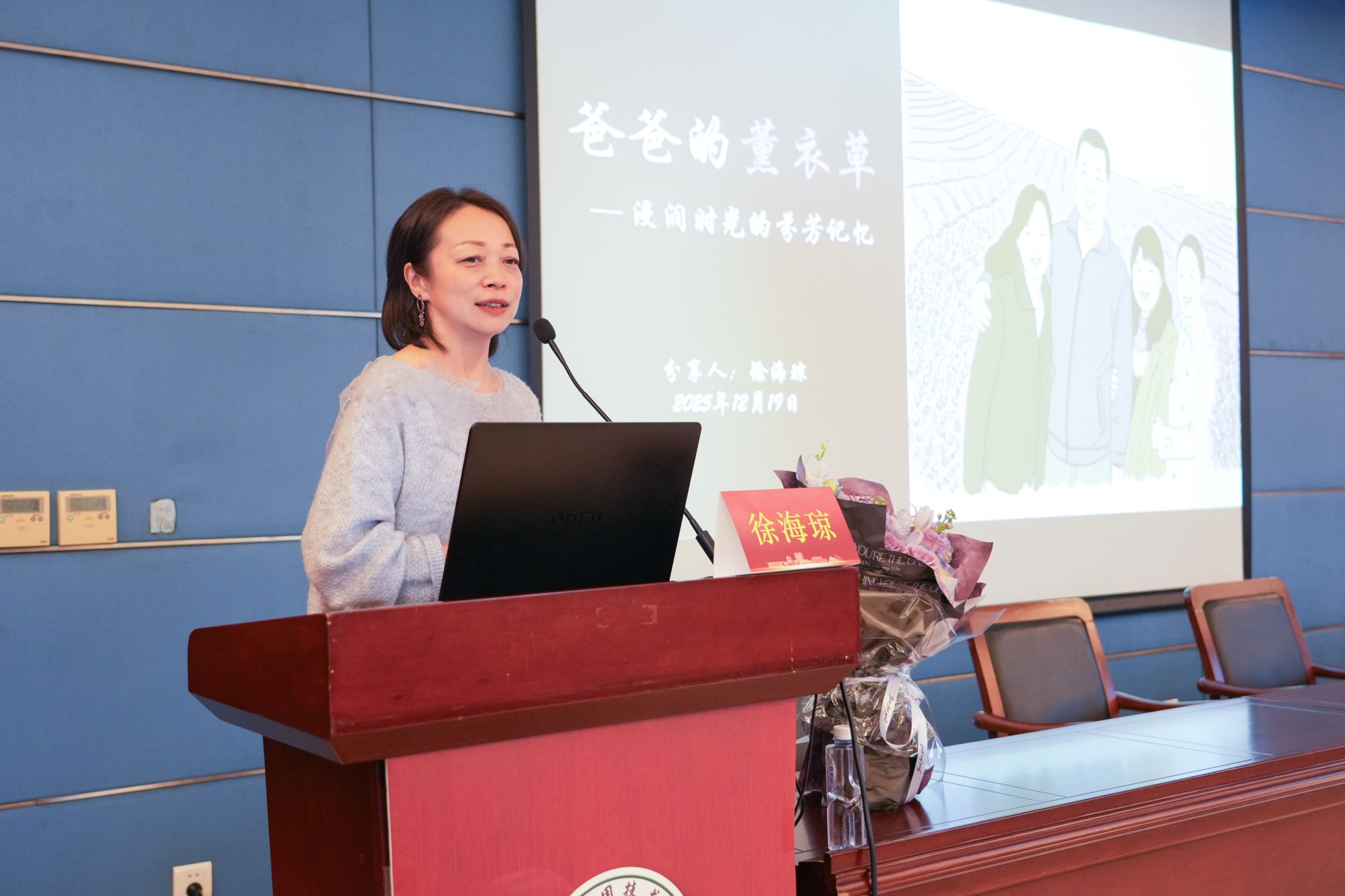 讲座现场,徐海琼以“初心”为引,通过互动提问迅速拉近与学子的距离。她展示出珍藏的文史资料,将父亲徐春棠的奋斗岁月娓娓道来。1964年,徐春棠手握仅有的10克法国薰衣草种子,在伊犁河谷的戈壁荒滩上扎下根来。面对恶劣的自然条件与匮乏的技术支持,他迎难而上、反复试验,不仅成功攻克薰衣草规模化种植的技术难题,更自主设计出蒸汽蒸馏锅,提炼出的薰衣草精油品质达到国际先进水平,一举终结了我国薰衣草香料长期依赖进口的被动局面。