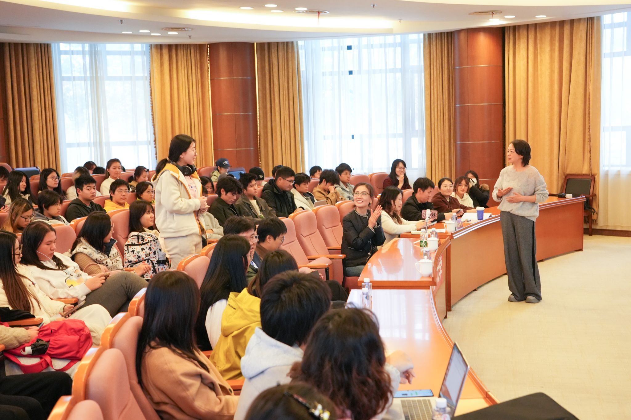 徐海琼还分享了薰衣草精油在失眠舒缓、伤痛护理等20余种生活场景中的妙用,让在场师生直观感受到香料科技的实用价值。当谈及阔别47年重返新疆,在无垠的薰衣草花海中凝望父亲铜像的瞬间,她几度动容。那句父亲生前的谆谆寄语——“克服骄娇两气,把喜欢的事做到极致,生命就有意义”,更是直击人心,引发全场师生强烈共鸣。互动环节中,学子们踊跃提问,现场气氛热烈真挚。