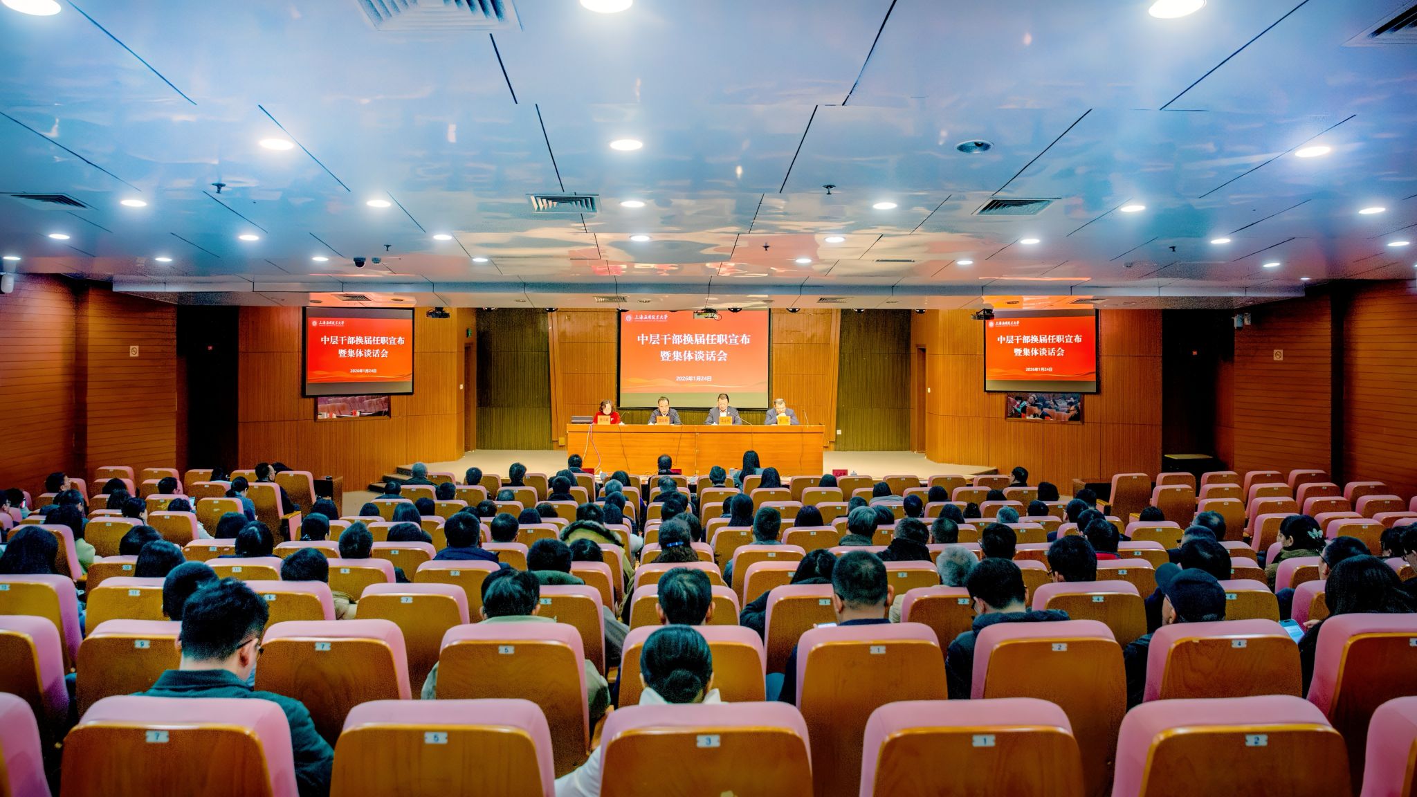 1月24日上午,学校第八轮中层干部换届任职宣布暨集体廉政谈话会在徐汇校区图文信息楼116报告厅举行。全体校领导、全体中层干部参加会议。会议由校长汪小帆主持。